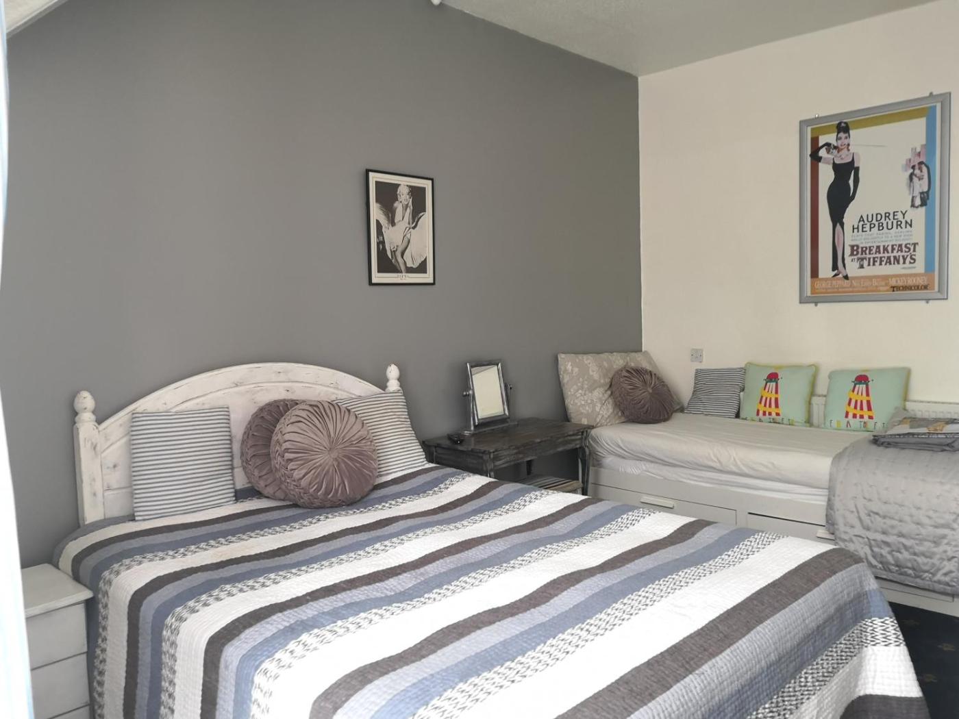 Family Room. This is an en-suite room with a double bed, a bunk bed . There is a sitting area with a sofa bed near bay window, each bright, airy room has a digital TV with Freeview channels, free WiFi access, a clock radio and a hairdryer. The room can accommodate maximum 4 guests. ;