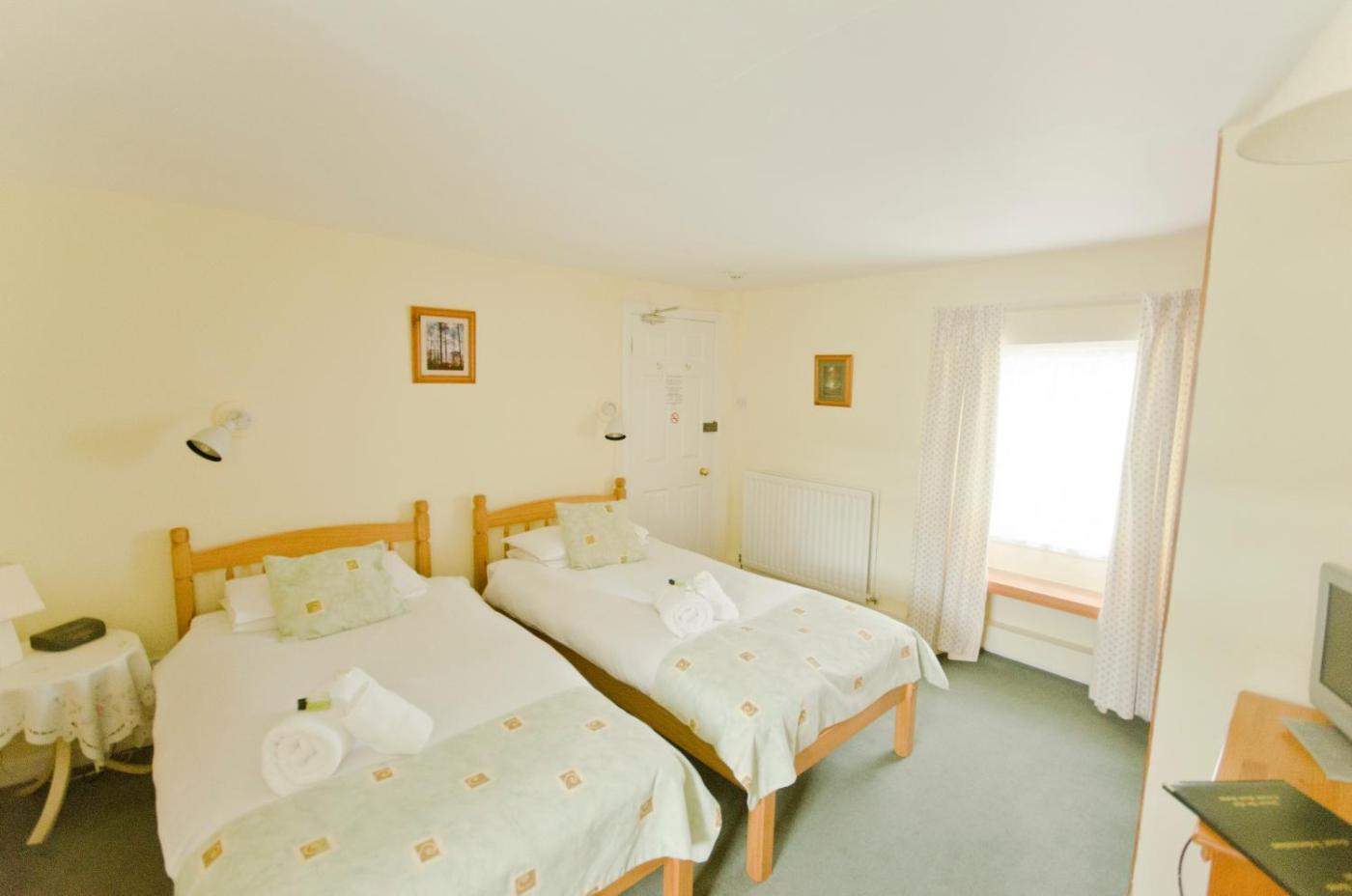 Twin Room. The Esk, Bowmont and Jedwater rooms. These cozy and comfortable individually decorated rooms have a smart TV, Tea and Coffee making facilities and en suite bathroom with complimentary toiletries and hairdryer. They also offer free WiFi and views over Ruberslaw Hill or the Village Green. The Auld Cross Keys Inn is well over 200 years old and some of the rooms are smaller than others with sloping ceilings, please give us a call if you have specific requirements. ;