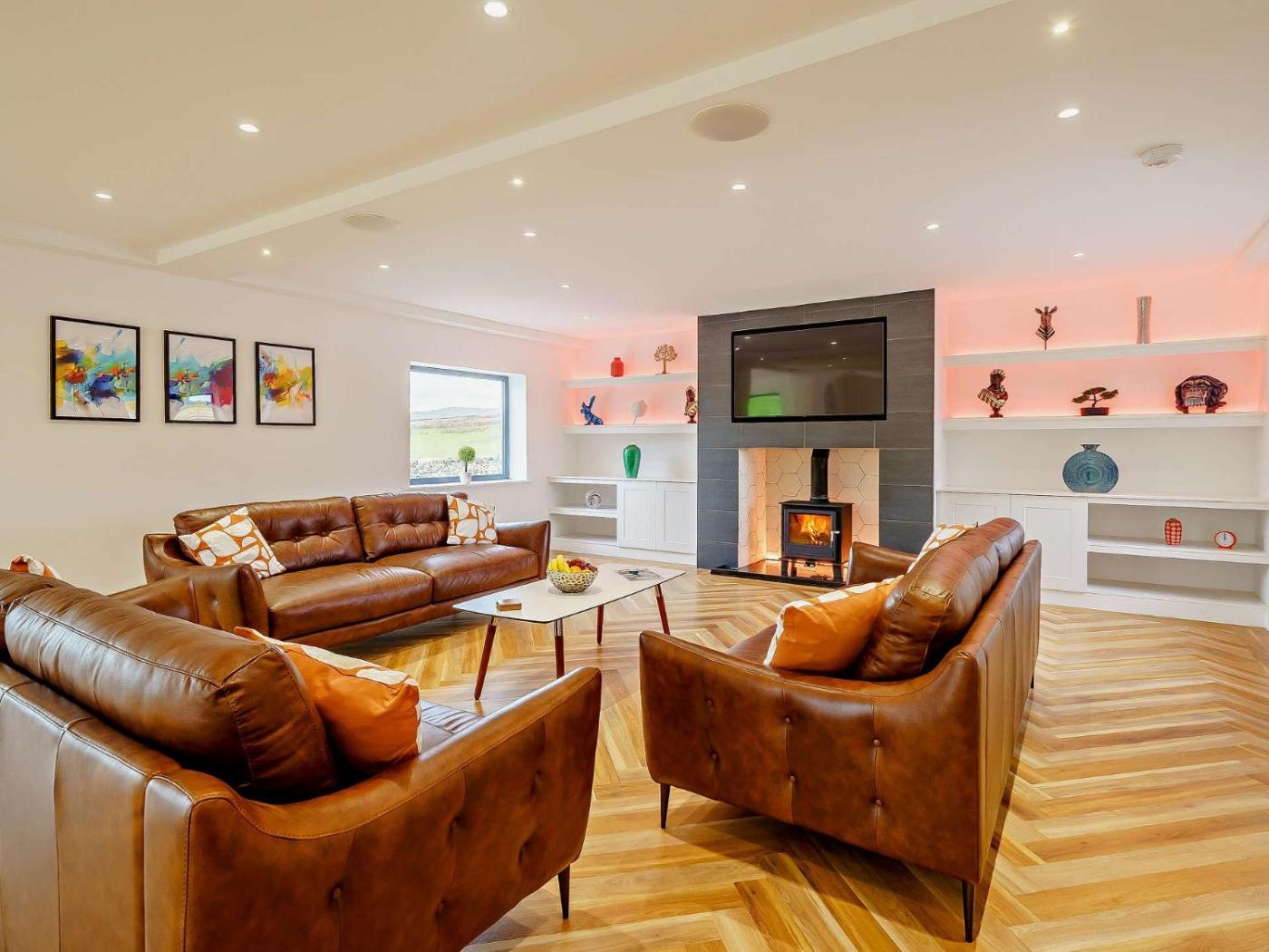Four-Bedroom House. This holiday home features a fireplace. The holiday home has 4 bedrooms, 3 bathrooms and a kitchen. Guests can make meals in the kitchen that has a refrigerator, a dishwasher, kitchenware and an oven. The holiday home features a TV, a washing machine, a high chair for children, heating as well as garden views. The unit has 5 beds.