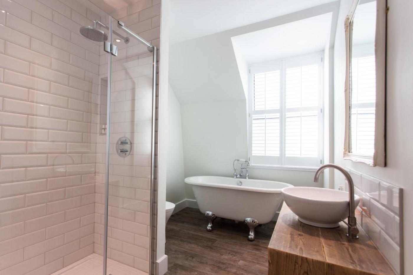 Large Double Room with Sea View - 5. With a sea view to the side across St Ives Harbour, this large double room has a large en-suite with walk-in shower and separate bath. It also includes a flat-screen TV. Please note this room is on the second floor and is accessed via the stairs. Contains a welcome tray with complimentary tea, coffee and a kettle. ;
